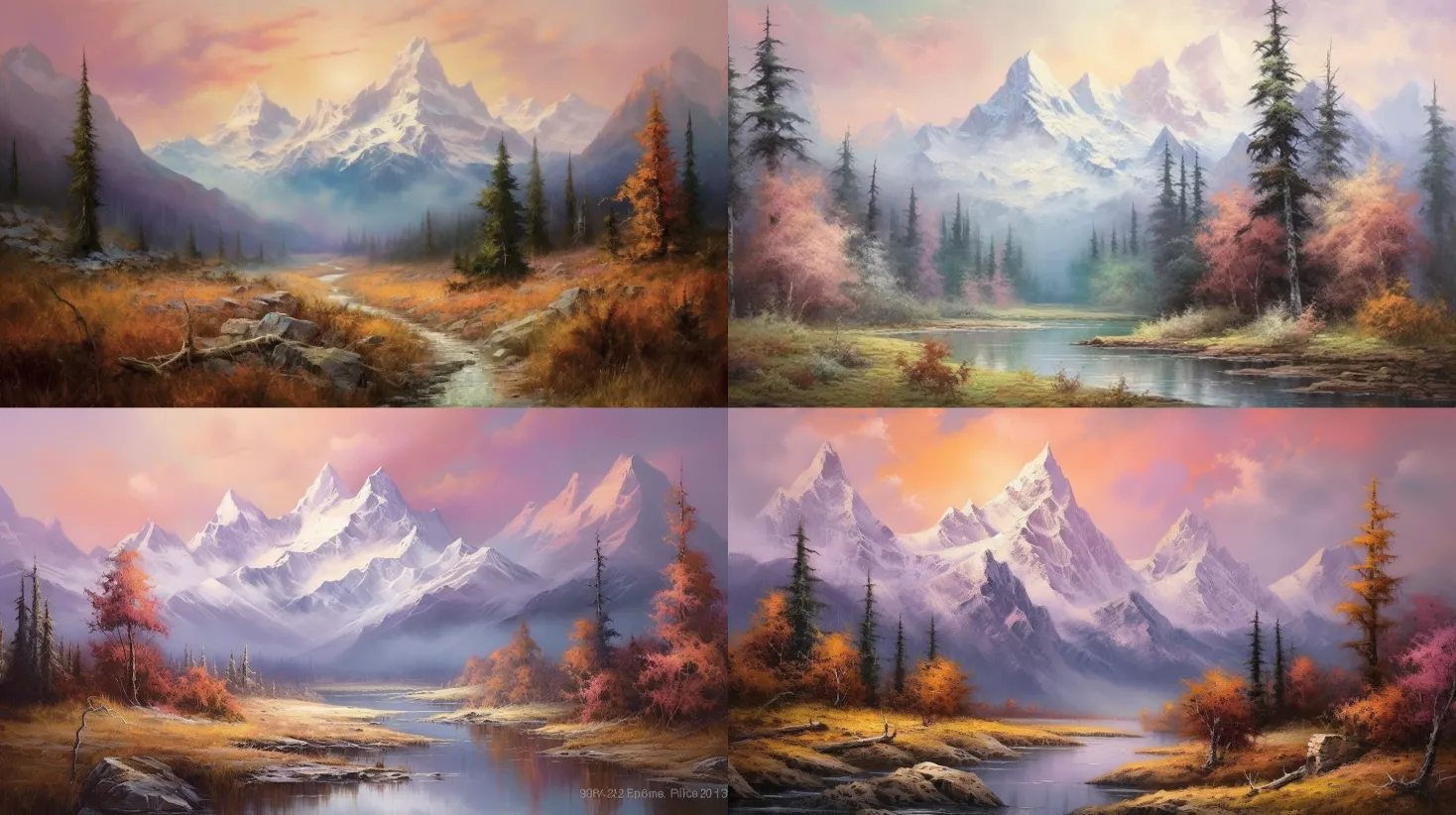 A breathtaking landscape featuring towering mountain peaks, covered in snow and surrounded by lush valleys. Medium: oil painting. Style: realistic with a touch of impressionism. Colors: a mix of cool and warm tones, capturing the changing light and atmosphere. Composition: emphasizing the grandeur and rugged beauty of the mountains, with a sense of depth and scale. --ar 16:9 --v 5.1 --style raw --q 2 --s 750A serene coastal landscape with golden sandy beaches, crystal-clear waters, and gentle waves. Medium: watercolor painting. Style: vibrant and atmospheric. Colors: a mix of warm beach tones, cool ocean blues, and vibrant tropical accents. Composition: capturing the tranquility and beauty of the coastal environment, with a focus on the interplay of light and water. --ar 16:9 --v 5.1 --style raw --q 2 --s 750An enchanting forest landscape filled with tall, ancient trees, dappled sunlight, and a carpet of vibrant green moss. Medium: digital painting. Style: ethereal and mystical. Colors: a mix of deep forest greens, earthy tones, and pops of vibrant flora. Composition: evoking a sense of wonder and magic, with a winding path inviting the viewer to explore the depths of the forest. --ar 16:9 --v 5.1 --style raw --q 2 --s 750A serene lake surrounded by rolling hills, lush vegetation, and a calm reflective surface. Medium: acrylic painting. Style: realistic with a touch of impressionism. Colors: a harmonious blend of blues, greens, and warm earth tones. Composition: capturing the peacefulness and tranquility of the lake, with the surrounding landscape mirrored in the water. --ar 16:9 --v 5.1 --style raw --q 2 --s 750A mesmerizing night sky filled with sparkling stars, with silhouettes of mountains or trees in the foreground. Medium: mixed media (watercolor and ink). Style: dreamy and atmospheric. Colors: a mix of deep blues, purples, and shimmering metallic accents. Composition: creating a sense of wonder and awe, with the night sky as the main focus, invoking a feeling of peace and connection to the universe. --ar 16:9 --v 5.1 --style raw --q 2 --s 750A picturesque countryside scene with gently rolling hills, fields of colorful flowers, and a winding river. Medium: oil painting. Style: traditional and realistic. Colors: a mix of vibrant and natural hues, capturing the beauty and tranquility of rural landscapes. Composition: conveying a sense of serenity and capturing the idyllic charm of the countryside. --ar 16:9 --v 5.1 --style raw --q 2 --s 750A captivating desert landscape with towering sand dunes, a lush oasis with palm trees, and a clear blue sky. Medium: digital painting. Style: realistic with a touch of surrealism. Colors: a mix of warm desert tones, cool oasis greens, and vibrant sky blues. Composition: contrasting the arid desert with the vibrant oasis, creating a sense of harmony and tranquility in the midst of the harsh desert environment. --ar 16:9 --v 5.1 --style raw --q 2 --s 750A dramatic coastal landscape featuring rugged cliffs, crashing waves, and a sweeping panoramic view of the sea. Medium: acrylic painting. Style: impressionistic with bold brushstrokes. Colors: a mix of deep blues, earthy tones, and vibrant coastal colors. Composition: capturing the raw power and beauty of the coastline, with the cliffs leading the viewer's eye towards the expansive ocean. --ar 16:9 --v 5.1 --style raw --q 2 --s 750A tranquil meadow scene with blooming wildflowers, tall grasses, and scattered trees. Medium: watercolor painting. Style: soft and dreamlike. Colors: a harmonious blend of pastel shades, capturing the gentle and serene ambiance of the meadow. Composition: evoking a sense of peace and serenity, with the meandering path inviting the viewer to wander through the idyllic landscape. --ar 16:9 --v 5.1 --style raw --q 2 --s 750An awe-inspiring volcanic landscape featuring a towering volcano, rugged lava fields, and a fiery sunset sky. Medium: digital painting. Style: realistic with a touch of fantasy. Colors: a mix of warm volcanic tones, vibrant sunset hues, and smoky atmospheric effects. Composition: capturing the raw power and beauty of the volcanic environment, with the volcano as the focal point and the dramatic sky adding a sense of intensity. --ar 16:9 --v 5.1 --style raw --q 2 --s 750A nostalgic landscape depicting golden fields of wheat or sunflowers during the harvest season, with a rustic barn in the distance. Medium: oil painting. Style: traditional and realistic. Colors: a mix of warm golden tones, earthy browns, and hints of vibrant harvest colors. Composition: evoking a sense of abundance and the beauty of the harvest season, with the fields stretching to the horizon. --ar 16:9 --v 5.1 --style raw --q 2 --s 750A serene winter landscape with snow-covered trees, frozen lakes, and a clear blue sky. Medium: watercolor painting. Style: soft and delicate. Colors: a mix of cool winter whites, soft blues, and subtle shades of gray. Composition: capturing the quiet beauty and tranquility of the winter season, with the glistening snow creating a peaceful atmosphere. --ar 16:9 --v 5.1 --style raw --q 2 --s 750A captivating sunset scene with warm golden hues, casting a magical glow over the landscape. Medium: acrylic painting. Style: vibrant and expressive. Colors: a mix of rich oranges, golden yellows, and deep purples, capturing the warmth and radiance of the setting sun. Composition: conveying the awe-inspiring beauty of the sunset, with the vibrant colors reflecting on the land and water. --ar 16:9 --v 5.1 --style raw --q 2 --s 750A tranquil river scene with lush vegetation, overhanging trees, and the gentle flow of water. Medium: digital painting. Style: realistic with a touch of impressionism. Colors: a mix of cool and warm tones, capturing the reflective quality of the water and the vibrant greens of the surrounding foliage. Composition: creating a sense of serenity and tranquility, with the river winding through the landscape and inviting the viewer to immerse themselves